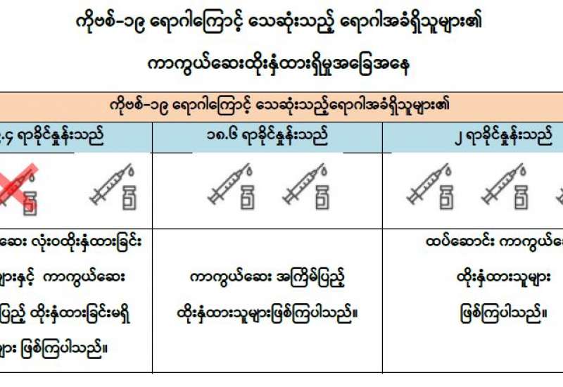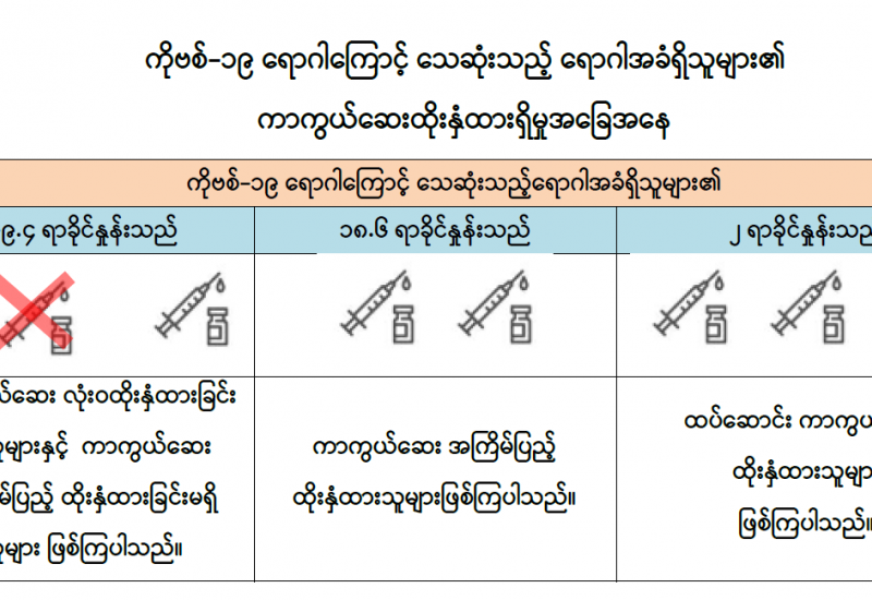 ကျန်းမာရေးဝန်ကြီးဌာနအနေဖြင့် နိုင်ငံအတွင်းကူးစက်ဖြစ်ပွားနေသော COVID-19 ရောဂါ ကာကွယ်၊ ကုသ၊ ထိန်းချုပ်ရေး လုပ်ငန်းများကို အရှိန်အဟုန်မပြတ် ဆောင်ရွက်လျက်ရှိပါသည်။