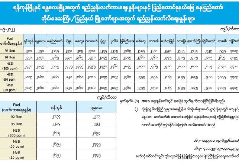 ရန်ကုန်မြို့နှင့် မန္တလေးမြို့အတွက် ရည်ညွှန်းလက်ကားဈေးနှုန်းများနှင့် ပြည်ထောင်စု နယ်မြေ နေပြည်တော်၊ တိုင်းဒေသကြီး/ပြည်နယ်မြို့တော်များအတွက် ရည်ညွှန်းလက်လီ ဈေးနှုန်းများ