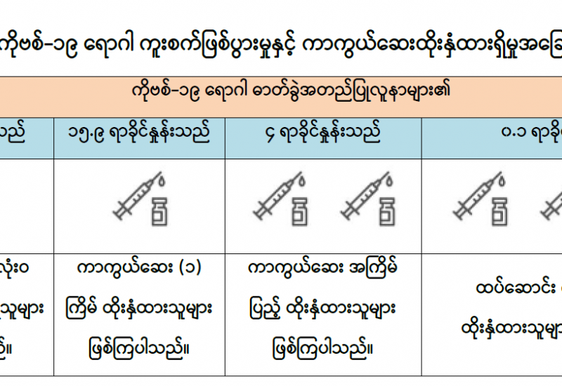 ကျန်းမာရေးဝန်ကြီးဌာနအနေဖြင့် နိုင်ငံအတွင်း ကူးစက်ဖြစ်ပွားနေသော COVID-19 ရောဂါ ကာကွယ်၊ ကုသ၊ ထိန်းချုပ်ရေးလုပ်ငန်းများကို အရှိန်အဟုန်မပြတ် ဆောင်ရွက်လျက် ရှိပါသည်။