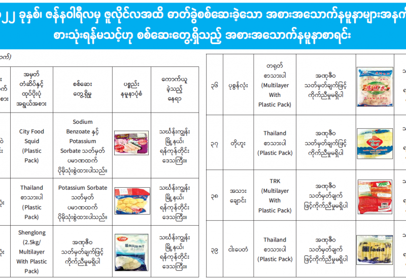 ၂၀၂၂ ခုနှစ်၊ ဇန်နဝါရီလမှ ဇူလိုင်လအထိ ဓာတ်ခွဲစစ်ဆေးခဲ့သော အစားအသောက် နမူနာများအနက်မှ စားသုံးရန်မသင့်ဟု စစ်ဆေးတွေ့ရှိသည့် အစားအသောက်နမူနာစာရင်း