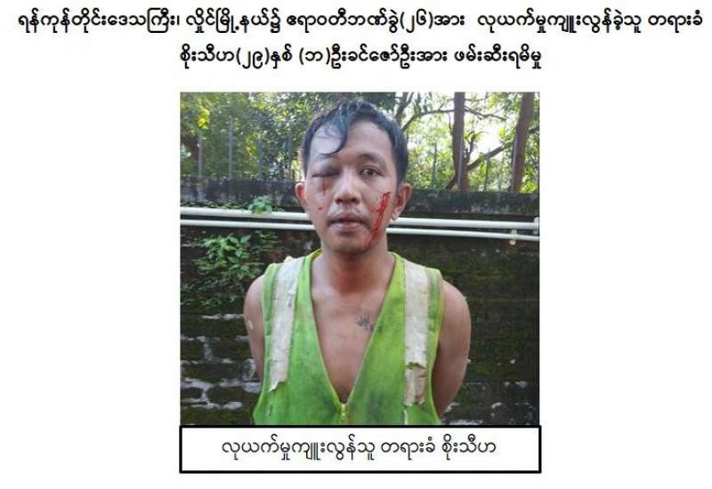 ရန်ကုန်တိုင်းဒေသကြီး၊ လှိုင်မြို့နယ်၌ ဧရာဝတီဘဏ်ခွဲ(၂၆)အား ဝင်ရောက်လုယက်ခဲ့သူ အမျိုးသားတစ်ဦးကို ဒုစရိုက်မှုမလိုလားသည့် တာဝန်သိပြည်သူများ၏ ပူးပေါင်းကူညီမှုဖြင့် အချိန်တိုအတွင်း ဖော်ထုတ်ဖမ်းဆီးရမိခဲ့ကြောင်း သိရသည်။