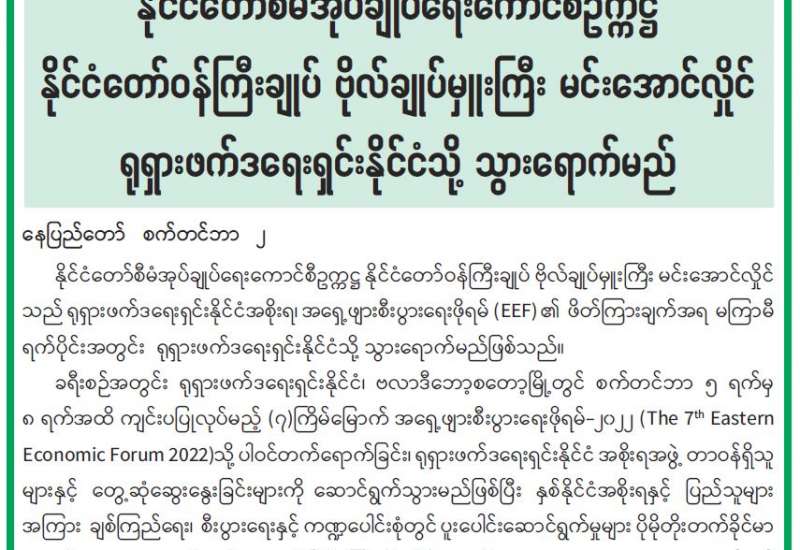 နိုင်ငံတော်စီမံအုပ်ချုပ်ရေးကောင်စီဥက္ကဋ္ဌ နိုင်ငံတော်ဝန်ကြီးချုပ် ဗိုလ်ချုပ်မှူးကြီး မင်းအောင်လှိုင် ရုရှားဖက်ဒရေးရှင်းနိုင်ငံသို့ သွားရောက်မည်