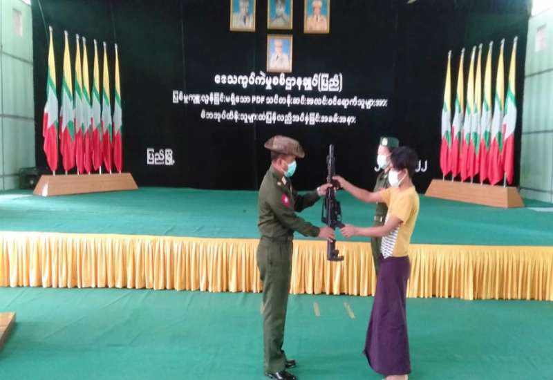 တိုင်းရင်းသားလက်နက်ကိုင်အဖွဲ့နယ်မြေအတွင်း သင်တန်းများတက်ရောက်ခဲ့ပြီး ပြစ်မှုကျူးလွန်ခြင်းမရှိခဲ့သည့် ဥပဒေဘောင်အတွင်းဝင်ရောက်လာသော PDF အဖွဲ့ဝင် ၄ ဦးအား ပြန်လည်ကြိုဆိုလက်ခံ၍ ၎င်း၏ မိဘအုပ်ထိန်းသူများထံသို့ လွှဲပြောင်းပေးအပ်လျက်ရှိရာ ယနေ့နံနက်ပိုင်းတွင် ပဲခူးတိုင်းဒေသကြီး၊ ပြည်မြို့၊ နယ်မြေခံတပ်ရင်းခန်းမ၌ လက်နက်၊ ခဲယမ်းများနှင့်အတူ ဥပဒေဘောင်အတွင်း ဝင်ရောက်ခဲ့သည့် PDF အဖွဲ့ဝင်များအား ကြိုဆိုလက်ခံ၍ ၎င်းတို့၏ မိဘအုပ်ထိန်းသူများထံ လွှဲပြောင်းအပ်နှံခြင်းကို ပြုလုပ်ကြသည်။