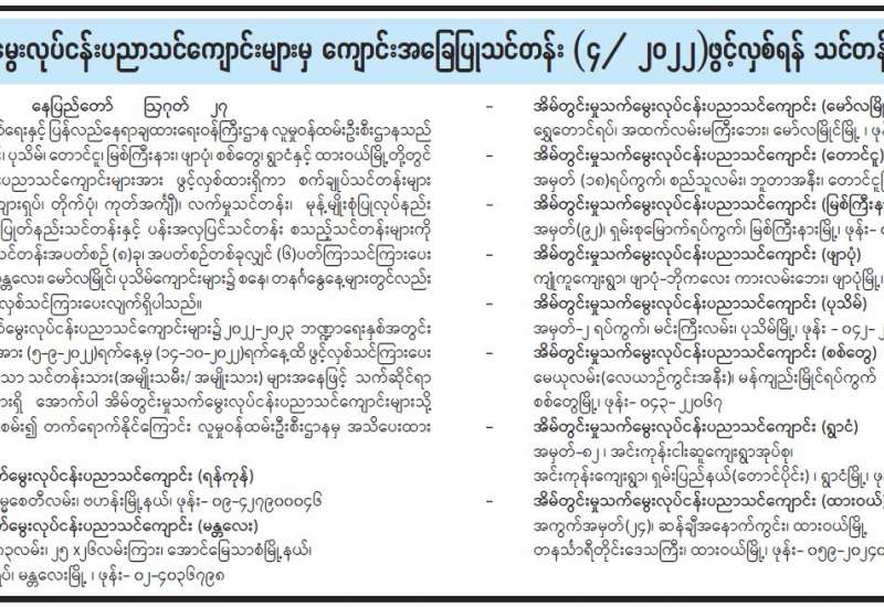 အိမ်တွင်းမှုအသက်မွေးလုပ်ငန်းပညာသင်တန်းကျောင်းများမှ ကျောင်းအခြေပြုသင်တန်း (၄/၂၀၂၂) ဖွင့်လှစ်ရန် သင်တန်းသားခေါ်ယူခြင်း