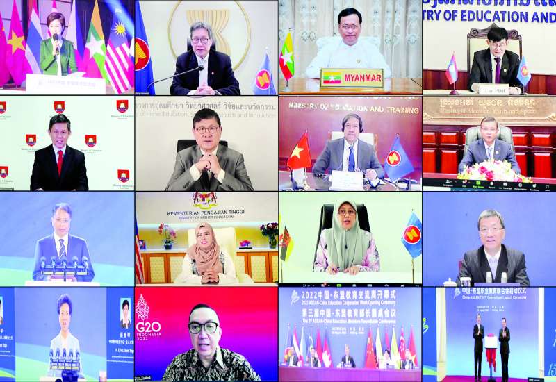 တရုတ်ပြည်သူ့သမ္မတနိုင်ငံ ကွေ့ကျိုးပြည်နယ်တွင် ကျင်းပသော ၂၀၂၂ ခုနှစ် (၁၅)ကြိမ်မြောက် တရုတ်-အာဆီယံ ပညာရေးပူးပေါင်းဆောင်ရွက်မှု သီတင်းပတ်ဖွင့်ပွဲအခမ်းအနားကို ယနေ့နံနက် ၇ နာရီခွဲတွင် အွန်လိုင်းစနစ်ဖြင့်ကျင်းပရာ အာဆီယံအဖွဲ့ဝင်နိုင်ငံများမှ ပညာရေးဝန်ကြီးများနှင့် မြန်မာနိုင်ငံပညာရေးဝန်ကြီးဌာန ဒုတိယဝန်ကြီး ဒေါက်တာဇော်မြင့်တို့ တက်ရောက်ကြသည်။