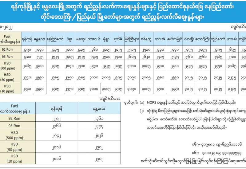 ရန်ကုန်မြို့နှင့် မန္တလေးမြို့အတွက် ရည်ညွှန်းလက်ကားဈေးနှုန်းများနှင့် ပြည်ထောင်စုနယ်မြေ နေပြည်တော်၊ တိုင်းဒေသကြီး/ပြည်နယ် မြို့တော်များအတွက် ရည်ညွှန်းလက်လီဈေးနှုန်းများ
