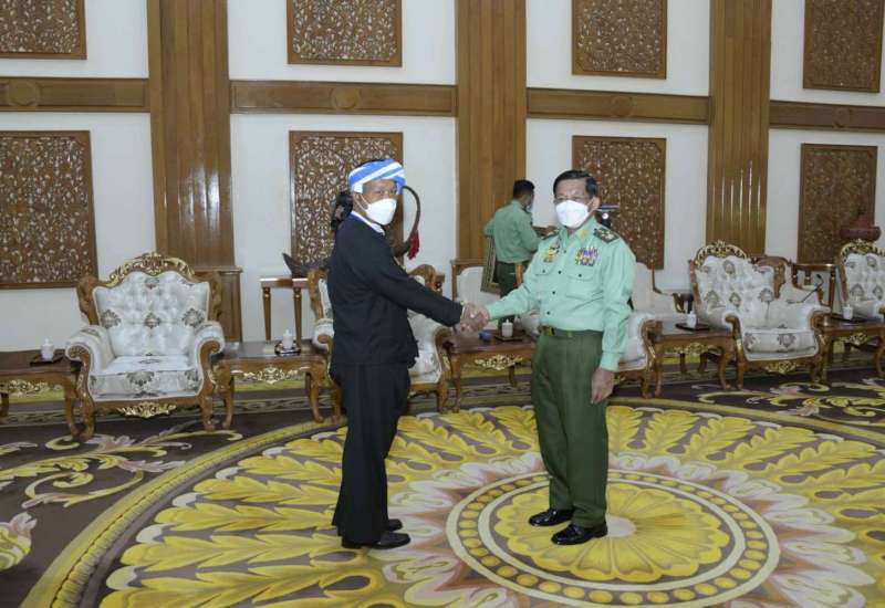 နိုင်ငံတော်စီမံအုပ်ချုပ်ရေးကောင်စီဥက္ကဋ္ဌ တပ်မတော်ကာကွယ်ရေးဦးစီးချုပ် ဗိုလ်ချုပ်မှူးကြီး မင်းအောင်လှိုင်သည် ပအိုဝ်းအမျိုးသားလွတ်မြောက်ရေးအဖွဲ့ချုပ် (PNLO)ဥက္ကဋ္ဌ ခွန်သူရိန်၊ လားဟူဒီမိုကရက်တစ်အစည်းအရုံး(LDU)ဥက္ကဋ္ဌ ကျောဆော်လမွန်နှင့် ရခိုင်ပြည် လွတ်မြောက်ရေးပါတီ (ALP) ဒုတိယဥက္ကဋ္ဌ စောမြရာဇာလင်းတို့ ဦးဆောင်သည့် ငြိမ်းချမ်းရေး ကိုယ်စားလှယ်အဖွဲ့အား ယနေ့နံနက်ပိုင်းတွင် နေပြည်တော်ရှိ ဘုရင့်နောင်ရိပ်သာ ဧည့်ခန်းမဆောင်၌ တွေ့ဆုံ၍ ငြိမ်းချမ်းရေးဆိုင်ရာ ကိစ္စရပ်များ ဆွေးနွေးသည်။