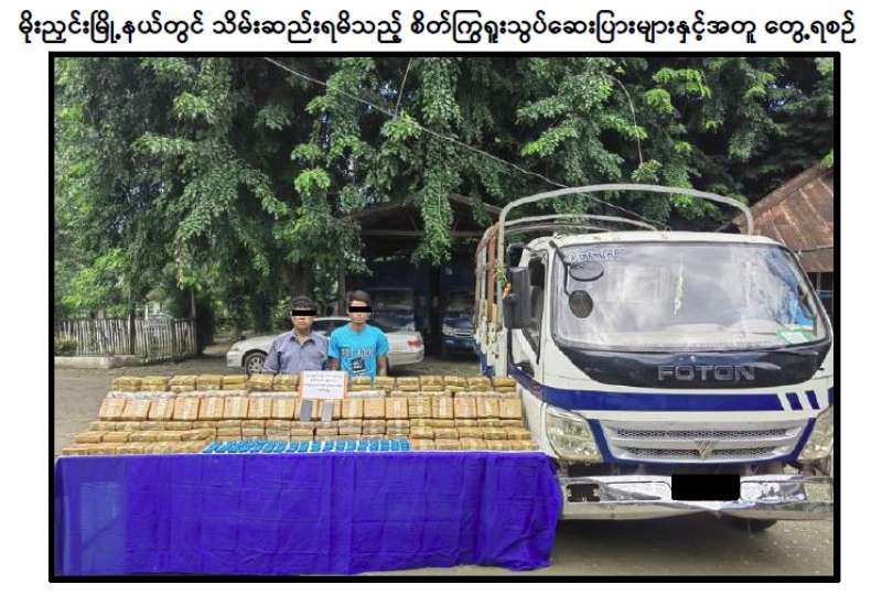 ကချင်ပြည်နယ်၊ မိုးညှင်းမြို့နယ်နှင့် မန္တလေးတိုင်းဒေသကြီး၊ သာစည်မြို့နယ်တို့တွင် ငွေကျပ် ၆ ဒသမ ၆၃ ဘီလီယံကျော်တန်ဖိုးရှိ စိတ်ကြွရူးသွပ်ဆေးပြား ၄၄ ဒသမ ၂ သိန်းကျော် ဖမ်းဆီးရမိ ခဲ့ကြောင်း မြန်မာနိုင်ငံရဲတပ်ဖွဲ့မှ သိရသည်။