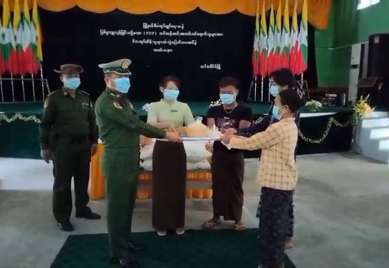 တိုင်းရင်းသားလက်နက်ကိုင်အဖွဲ့ နယ်မြေအတွင်း သင်တန်းများတက်ရောက်ခဲ့ပြီး ပြစ်မှု ကျူးလွန်ခြင်းမရှိခဲ့သည့် ဥပဒေဘောင်အတွင်း ဝင်ရောက်လာသော မကွေးတိုင်းဒေသကြီး၊ ဆင်ပေါင်ဝဲမြို့နယ်မှ PDF အဖွဲ့ဝင်များအား ၎င်း၏ မိဘအုပ်ထိန်းသူများထံသို့ ထပ်မံလွှဲပြောင်း ပေးအပ်ခြင်းကို ယနေ့တွင် ဆင်ပေါင်ဝဲမြို့နယ် စီမံအုပ်ချုပ်ရေးကောင်စီရုံး၌ ပြုလုပ်ရာ အလယ်ပိုင်းတိုင်းစစ်ဌာနချုပ်၊ သရက်တပ်နယ်နှင့် မြို့နယ်စီမံအုပ်ချုပ်ရေးအဖွဲ့တို့မှ တာဝန်ရှိသူများ၊ ဥပဒေဘောင်အတွင်း ဝင်ရောက်လာသူများနှင့် ၎င်းတို့၏မိဘအုပ်ထိန်းသူများ တက်ရောက်ကြသည်။