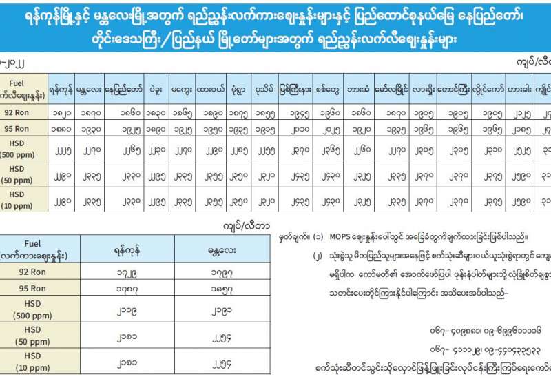 ရန်ကုန်မြို့နှင့် မန္တလေးမြို့အတွက် ရည်ညွှန်းလက်ကားဈေးနှုန်းများနှင့် ပြည်ထောင်စုနယ်မြေ နေပြည်တော်၊ တိုင်းဒေသကြီ/ပြည်နယ် မြို့တော်များအတွက် ရည်ညွှန်းလက်လီဈေးနှုန်းများ