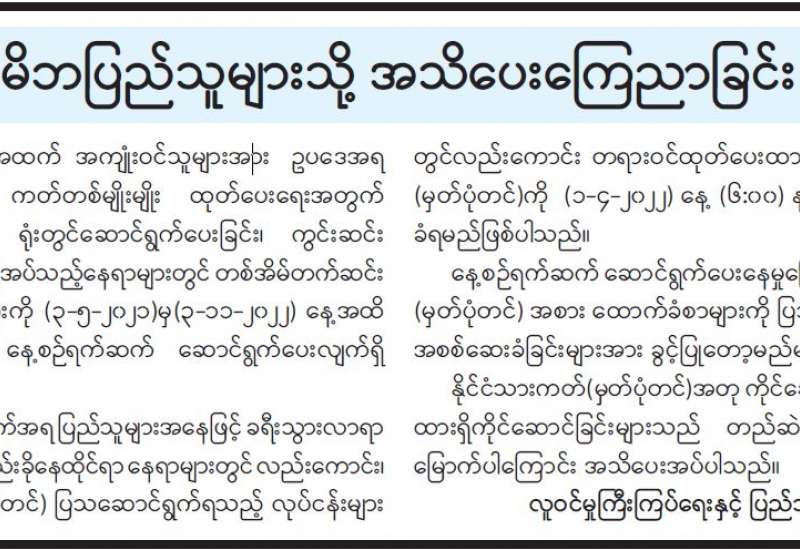 နယ်စပ်ဒေသအသီးသီးနှင့် အချို့သော တိုင်းရင်းသားလက်နက်ကိုင်အဖွဲ့များအတွင်းသို့ ရောက်ရှိနေသည့် CDM ဝန်ထမ်းများ၊ ကျောင်းသား၊ကျောင်းသူများနှင့် လူငယ်၊လူရွယ်များအား နယ်စပ်ကြိုဆိုရေး စခန်းအသီးသီးနှင့် နီးစပ်ရာတပ်မတော်၊ မြန်မာနိုင်ငံ ရဲတပ်ဖွဲ့စခန်းအသီးသီးသို့ ဆက်သွယ်၍ ဥပဒေဘောင်အတွင်း ပြန်လည်ဝင်ရောက်နိုင်ကြောင်းနှင့် ယင်းသို့ သတင်းပို့ ဆက်သွယ်သူများကို သတ်မှတ်စည်းကမ်းချက်များနှင့်အညီ နေ့စဉ်ပြည်သူ့ဘဝတွင် အေးချမ်းစွာ နေထိုင်နိုင်ရေး အာမခံချက်ပေးသွားမည်ဖြစ်ကြောင်း နိုင်ငံတော်စီမံအုပ်ချုပ်ရေးကောင်စီ သတင်းထုတ်ပြန်ရေးအဖွဲ့က အသိပေး ထုတ်ပြန်ထားရှိပြီး ဖြစ်ပါသည်။