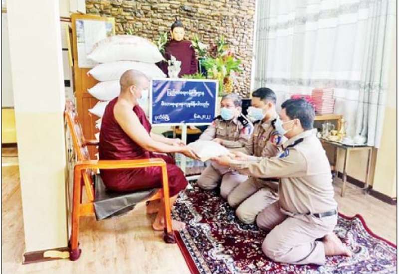 ပြည်ထဲရေးဝန်ကြီးဌာန တပ်ဖွဲ့ဝင်/ဝန်ထမ်းအရာထမ်း၊ အမှုထမ်းမိသားစုများက မြို့နယ်အသီးသီးရှိ ဘုန်းတော်ကြီးကျောင်းများသို့ ဆွမ်းဆန်တော်များ ဆက်ကပ်လှူဒါန်းခြင်းကို လှူဒါန်းလျက်ရှိသည်။