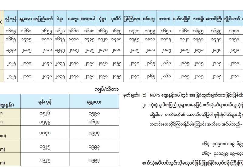ရန်ကုန်မြို့နှင့် မန္တလေးမြို့အတွက် ရည်ညွှန်းလက်ကားဈေးနှုန်းများနှင့် ပြည်ထောင်စုနယ်မြေ နေပြည်တော်၊ တိုင်းဒေသကြီး/ပြည်နယ် မြို့တော်များအတွက် ရည်ညွှန်းလက်လီဈေးနှုန်းများ