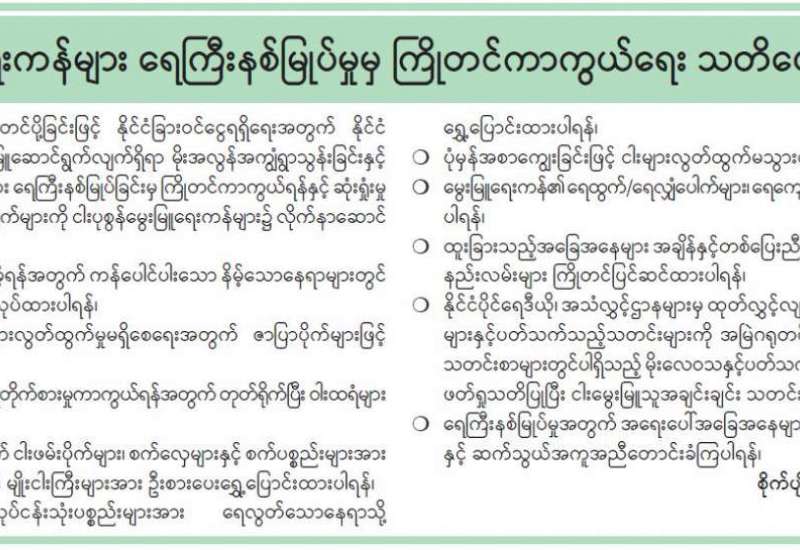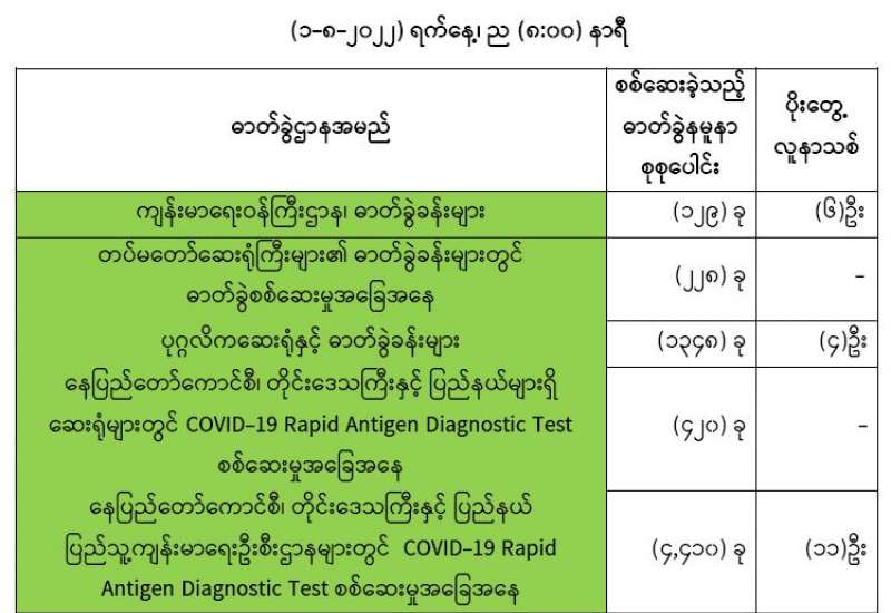 ကျန်းမာရေးဝန်ကြီးဌာနအနေဖြင့် နိုင်ငံအတွင်း ကူးစက်ဖြစ်ပွားနေသော COVID-19 ရောဂါ ကာကွယ်၊ ကုသ၊ ထိန်းချုပ်ရေးလုပ်ငန်းများကို အရှိန်အဟုန်မပြတ် ဆောင်ရွက်လျက်ရှိပါသည်။