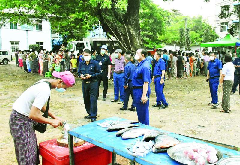 ရန်ကုန်တိုင်းဒေသကြီး စည်ပင်သာယာရေးဝန်ကြီး၊ ရန်ကုန်မြို့တော်စည်ပင်သာယာရေးကော်မတီဥက္ကဋ္ဌ (မြို့တော်ဝန်)ဦးဗိုလ်ဌေးသည် အတွင်းရေးမှူး ဦးညွန့်ဖေနှင့်အတူ ယနေ့နံနက်ပိုင်းက မင်္ဂလာတောင်ညွန့်မြို့နယ် စက်ရုံလမ်းရှိ မအူကုန်းစည်ပင်ဝန်ထမ်းအိမ်ရာဝင်းအတွင်း ရွေ့လျားဈေးကား(Mobile Market)စနစ်ဖြင့် ကုန်စိမ်း၊ ကုန်ခြောက်မျိုးစုံ၊ အသားမျိုးစုံနှင့် ငါး/ပုစွန်အမျိုးမျိုးတို့ကို ဈေးနှုန်းသက်သာစွာဖြင့် ဝယ်ယူနိုင်ရန် ရောင်းချပေးနေမှုကို သွားရောက်ကြည့်ရှုစစ်ဆေးပြီး ကျန်းမာရေးဝန်ကြီးဌာနက ထုတ်ပြန်ထားသော ညွှန်ကြားချက်များ၊ အသိပေးချက်များကို လိုက်နာ၍ ဈေးရောင်း/ဈေးဝယ် ပြုလုပ်ကြရန်မှာကြားပြီး Mask များ ဝေငှသည်။