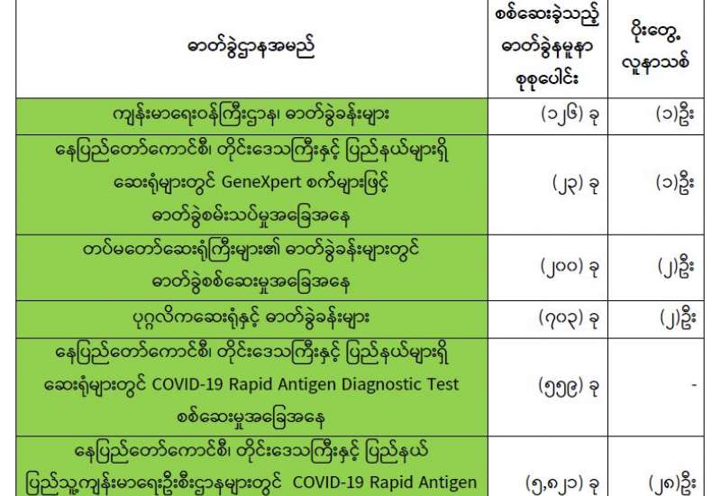 ကျန်းမာရေးဝန်ကြီးဌာနအနေဖြင့် နိုင်ငံအတွင်း ကူးစက်ဖြစ်ပွားနေသော COVID-19 ရောဂါ ကာကွယ်၊ ကုသ၊ ထိန်းချုပ်ရေးလုပ်ငန်းများကို အရှိန်အဟုန်မပြတ် ဆောင်ရွက်လျက်ရှိပါသည်။
