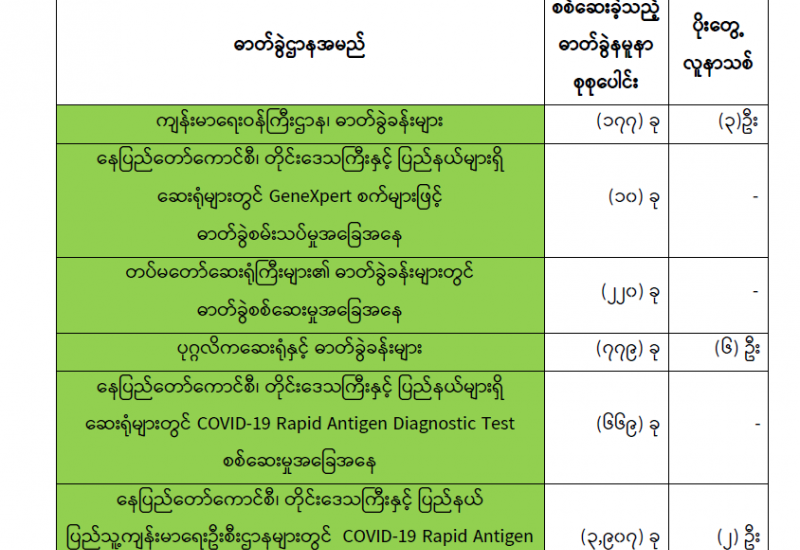 ကျန်းမာရေးဝန်ကြီးဌာနအနေဖြင့် နိုင်ငံအတွင်း ကူးစက်ဖြစ်ပွားနေသော COVID-19 ရောဂါ ကာကွယ်၊ ကုသ၊ ထိန်းချုပ်ရေးလုပ်ငန်းများကို အရှိန်အဟုန်မပြတ် ဆောင်ရွက်လျက်ရှိရာ ရောဂါထိန်းချုပ်ရေးလုပ်ငန်းများ အောင်မြင်နိုင်ရေးအတွက် ပြည်သူလူထုအနေဖြင့် ကျန်းမာရေးဝန်ကြီးဌာနမှ ထုတ်ပြန်ထားသော COVID-19 ရောဂါကာကွယ် ထိန်းချုပ်ရေးဆိုင်ရာ စည်းကမ်းများကို စနစ်တကျ လိုက်နာဆောင်ရွက်ရန် လိုအပ်ပြီး COVID-19 ကာကွယ်ဆေး ထိုးနှံမှုခံယူခြင်းအား အထူးဂရုပြု ပူးပေါင်းဆောင်ရွက်ကြရန် လိုအပ်ပါသည်။