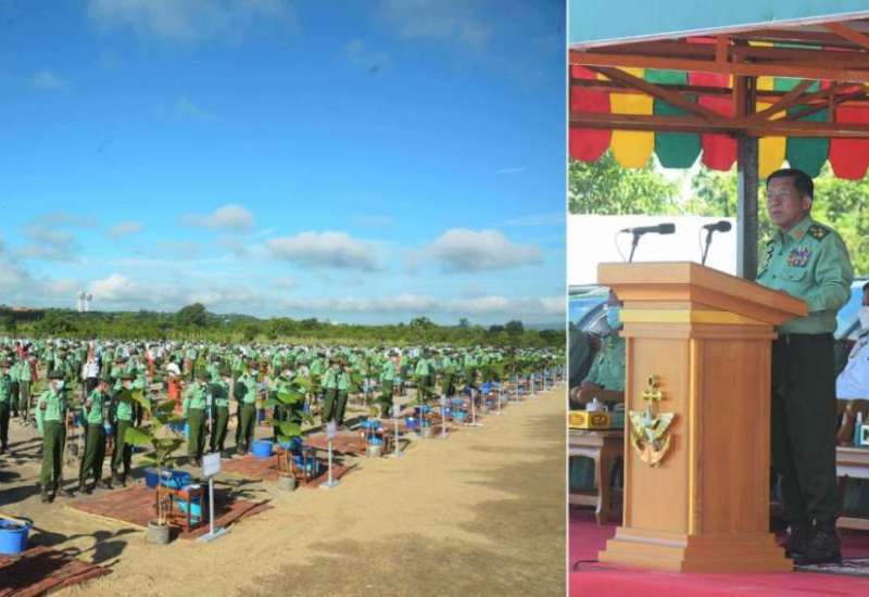 ၂၀၂၂ ခုနှစ်၊ ကာကွယ်ရေးဦးစီးချုပ်ရုံး (ကြည်း၊ ရေ၊ လေ) မိသားစုများ၏ ဒုတိယအကြိမ် မိုးရာသီသစ်ပင်စိုက်ပျိုးပွဲ အခမ်းအနားကို နေပြည်တော်၊ ဇေယျာသီရိမြို့နယ်၊ ရေဆင်းဆည်အနီး၌ ယနေ့နံနက်ပိုင်းတွင် ကျင်းပပြုလုပ်ရာ နိုင်ငံတော်စီမံအုပ်ချုပ်ရေးကောင်စီဥက္ကဋ္ဌ တပ်မတော်ကာကွယ်ရေးဦးစီးချုပ် ဗိုလ်ချုပ်မှူးကြီး မင်းအောင်လှိုင် တက်ရောက်၍ ရတနာတန်းဝင် ကျွန်းပင်ကို ဦးဆောင်စိုက်ပျိုးပေးသည်။