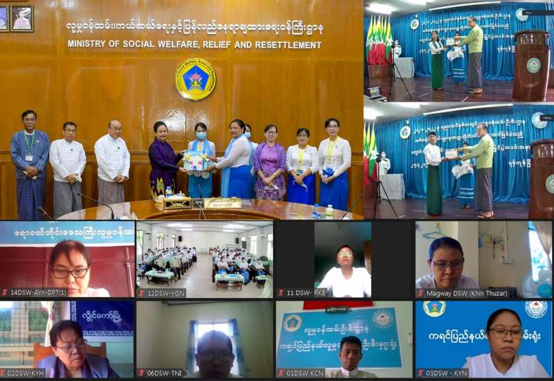 ၂၀၂၁-၂၀၂၂ ပညာသင်နှစ်အတွင်း လူမှုဝန်ထမ်း၊ ကယ်ဆယ်ရေးနှင့်ပြန်လည်နေရာချထားရေးဝန်ကြီးဌာန၊ လူမှုဝန်ထမ်းဦးစီးဌာနက ဖွင့်လှစ်ထားရှိသော သင်တန်းကျောင်းများမှ တက္ကသိုလ်ဝင်စာမေးပွဲတွင် ထူးချွန်စွာအောင်မြင်ခဲ့သည့် ကျောင်းသားကျောင်းသူများအား ဂုဏ်ပြုပွဲနှင့် လူမှုဝန်ထမ်းဦးစီးဌာနမှ ပြုစုထားရှိသည့် ပုံပြင်၊ ကဗျာ စာအုပ်(၃)မျိုး ဖြန့်ချိခြင်း အခမ်းအနားကို ယနေ့နံနက်ပိုင်းတွင် Virtual စနစ်ဖြင့် ကျင်းပသည်။