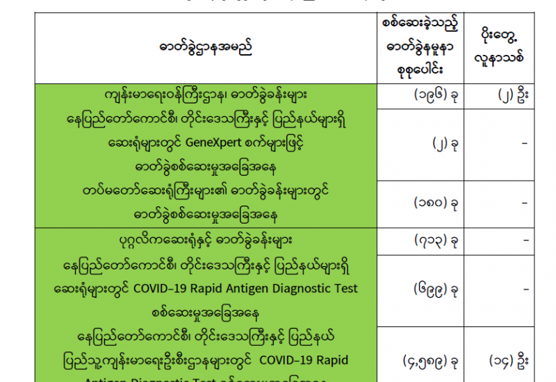 ကျန်းမာရေးဝန်ကြီးဌာနအနေဖြင့် နိုင်ငံအတွင်း ကူးစက်ဖြစ်ပွားနေသော COVID-19 ရောဂါ ကာကွယ်၊ ကုသ၊ ထိန်းချုပ်ရေးလုပ်ငန်းများကို အရှိန်အဟုန်မပြတ် ဆောင်ရွက်လျက်ရှိပါသည်။