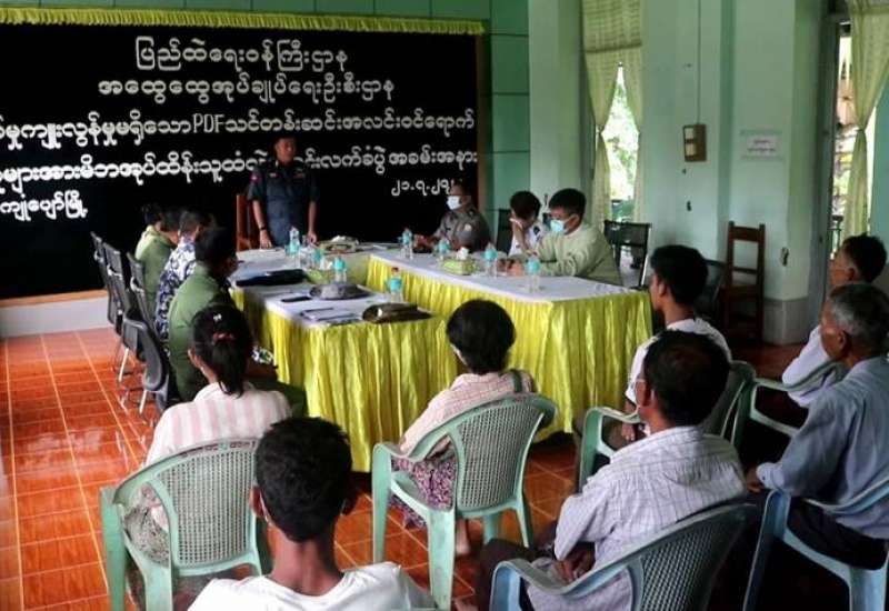 တိုင်းရင်းသား လက်နက်ကိုင်အဖွဲ့နယ်မြေအတွင်း သင်တန်းများတက်ရောက်ခဲ့ပြီး ပြစ်မှုကျူးလွန်ခြင်းမရှိခဲ့သည့် ဥပဒေဘောင်အတွင်း ဝင်ရောက်လာသော ဧရာဝတီတိုင်းဒေသကြီး၊ ကျုံပျော်မြို့မှ PDF အဖွဲ့ဝင်များအား ၎င်း၏ မိဘအုပ်ထိန်းသူများထံသို့ ထပ်မံလွှဲပြောင်းပေးအပ်ခြင်းကို ယနေ့တွင် ကျုံပျော်မြို့နယ် စီမံအုပ်ချုပ်ရေးအဖွဲ့ အစည်းအဝေးခန်းမ၌ပြုလုပ်ရာ အနောက်တောင်တိုင်းစစ်ဌာနချုပ်၊ ပုသိမ်တပ်နယ်၊ တပ်နယ်မှူး ဗိုလ်မှူးချုပ် ထွန်းဝင်းနှင့် တာဝန်ရှိသူများ၊ ဥပဒေဘောင်အတွင်း ဝင်ရောက်လာသူများနှင့် ၎င်းတို့၏ မိဘအုပ်ထိန်းသူများ တက်ရောက်ကြသည်။