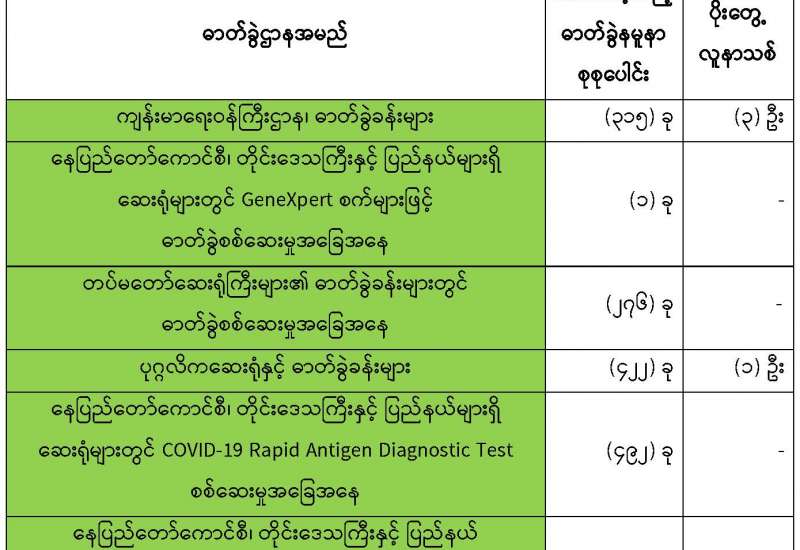 ကျန်းမာရေးဝန်ကြီးဌာနအနေဖြင့် နိုင်ငံအတွင်း ကူးစက်ဖြစ်ပွားနေသော COVID-19 ရောဂါ ကာကွယ်၊ ကုသ၊ ထိန်းချုပ်ရေးလုပ်ငန်းများကို အရှိန်အဟုန်မပြတ် ဆောင်ရွက်လျက်ရှိပါသည်။