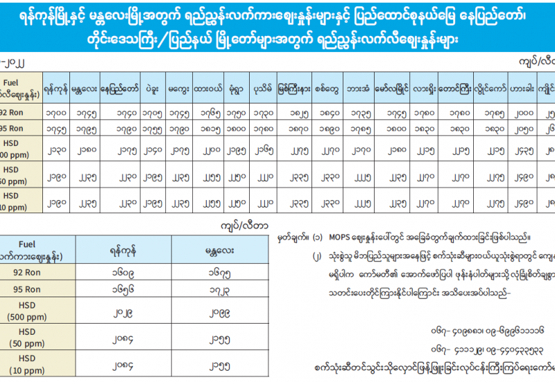 ရန်ကုန်မြို့နှင့် မန္တလေးမြို့အတွက် ရည်ညွှန်းလက်ကား ဈေးနှုန်းများနှင့် ပြည်ထောင်စုနယ်မြေ၊ နေပြည်တော်၊ တိုင်းဒေသကြီး/ ပြည်နယ်မြို့တော်များအတွက် ရည်ညွှန်းလက်လီဈေးနှုန်းများ