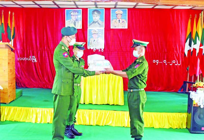 စစ်ကိုင်းတိုင်းဒေသကြီး နာဂ ကိုယ်ပိုင်အုပ်ချုပ်ခွင့်ရဒေသ လဟယ်မြို့သို့ ရောက်ရှိနေသော နိုင်ငံတော်စီမံအုပ်ချုပ်ရေး ကောင်စီအဖွဲ့ဝင် ကာကွယ်ရေးဝန်ကြီးဌာန ပြည်ထောင်စုဝန်ကြီး ဗိုလ်ချုပ်ကြီး မြထွန်းဦး၊ တိုင်း ဒေသကြီးဝန်ကြီးချုပ် ဦးမြတ်ကျော်၊ အနောက်မြောက်တိုင်း စစ်ဌာနချုပ် တိုင်းမှူး ဗိုလ်မှူးချုပ် သန်းထိုက်နှင့် တာဝန်ရှိသူများသည် ဇူလိုင် ၁၄ ရက် နံနက်ပိုင်းတွင် လဟယ်မြို့ရှိ နယ်မြေခံတပ်ရင်းခန်းမ၌ အရာရှိ၊ စစ်သည်၊ မိသားစုဝင်များအား တွေ့ဆုံအမှာစကားပြောကြားပြီး တပ်နယ်မိသားစုများအတွက် စားသောက်ဖွယ်ရာများနှင့် ကိုဗစ်-၁၉ ရောဂါကာကွယ်ရေး အထောက်အကူပြုပစ္စည်းများ ပေးအပ်သည်။