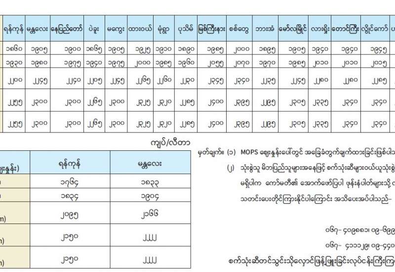 ရန်ကုန်မြို့နှင့်မန္တလေးမြို့အတွက် ရည်ညွှန်းလက်ကားဈေးနှုန်းများနှင့် ပြည်ထောင်စုနယ်မြေ၊ နေပြည်တော်၊ တိုင်းဒေသကြီး/ပြည်နယ်မြို့တော်များအတွက် ရည်ညွှန်းလက်လီဈေးနှုန်းများ