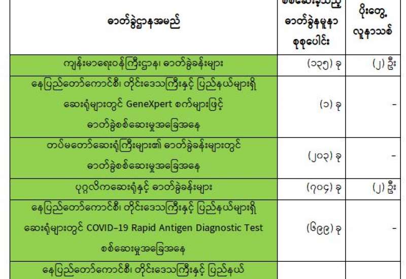 ကျန်းမာရေးဝန်ကြီးဌာနအနေဖြင့် နိုင်ငံအတွင်း ကူးစက်ဖြစ်ပွားနေသော COVID-19 ရောဂါ ကာကွယ်၊ ကုသ၊ ထိန်းချုပ်ရေးလုပ်ငန်းများကို အရှိန်အဟုန်မပြတ် ဆောင်ရွက်လျက်ရှိပါသည်။
