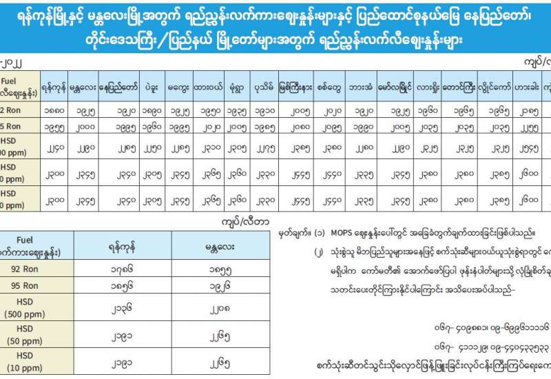 ရန်ကုန်မြို့နှင့် မန္တလေးမြို့အတွက် ရည်ညွှန်းလက်ကားဈေးနှုန်းများနှင့် ပြည်ထောင်စုနယ်မြေ နေပြည်တော်၊ တိုင်းဒေသကြီး/ ပြည်နယ် မြို့တော်များအတွက် ရည်ညွှန်းလက်လီဈေးနှုန်းများ