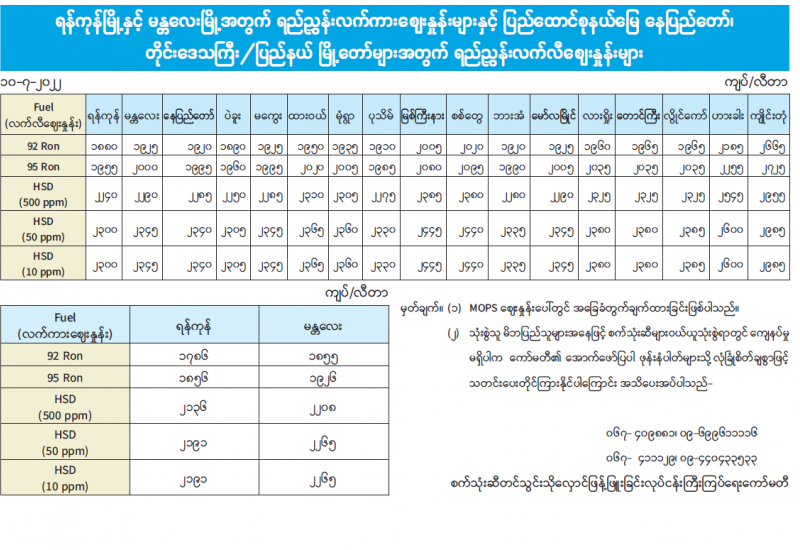 ရန်ကုန်မြို့နှင့် မန္တလေးမြို့အတွက် ရည်ညွှန်းလက်ကားဈေးနှုန်းများနှင့် ပြည်ထောင်စုနယ်မြေ နေပြည်တော်၊ တိုင်းဒေသကြီး/ပြည်နယ် မြို့တော်များအတွက် ရည်ညွှန်းလက်လီဈေးနှုန်းများ