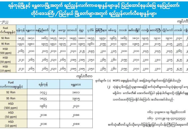 ရန်ကုန်မြို့နှင့် မန္တလေးမြို့အတွက် ရည်ညွှန်းလက်ကားဈေးနှုန်းများနှင့် ပြည်ထောင်စုနယ်မြေ နေပြည်တော်၊ တိုင်းဒေသကြီး/ပြည်နယ် မြို့တော်များအတွက် ရည်ညွှန်းလက်လီဈေးနှုန်းများ