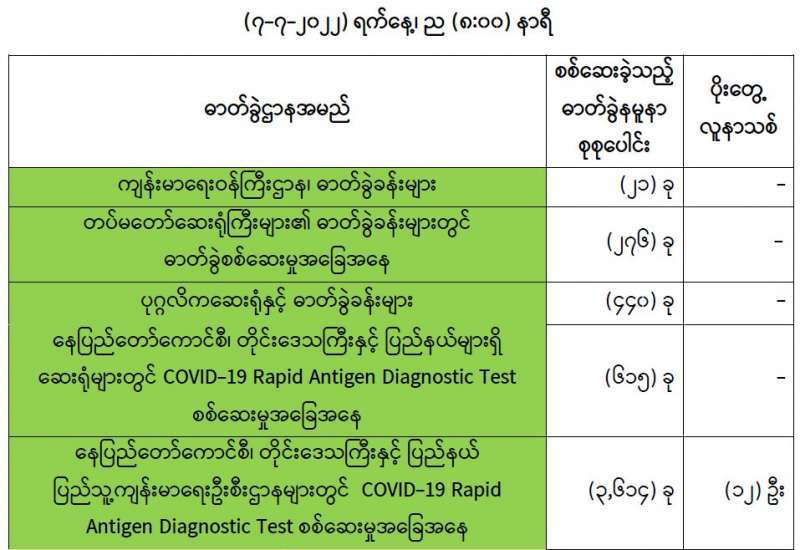 ကျန်းမာရေးဝန်ကြီးဌာနအနေဖြင့် နိုင်ငံအတွင်း ကူးစက်ဖြစ်ပွားနေသော COVID-19 ရောဂါ ကာကွယ်၊ ကုသ၊ ထိန်းချုပ်ရေးလုပ်ငန်းများကို အရှိန်အဟုန်မပြတ် ဆောင်ရွက်လျက်ရှိပါသည်။