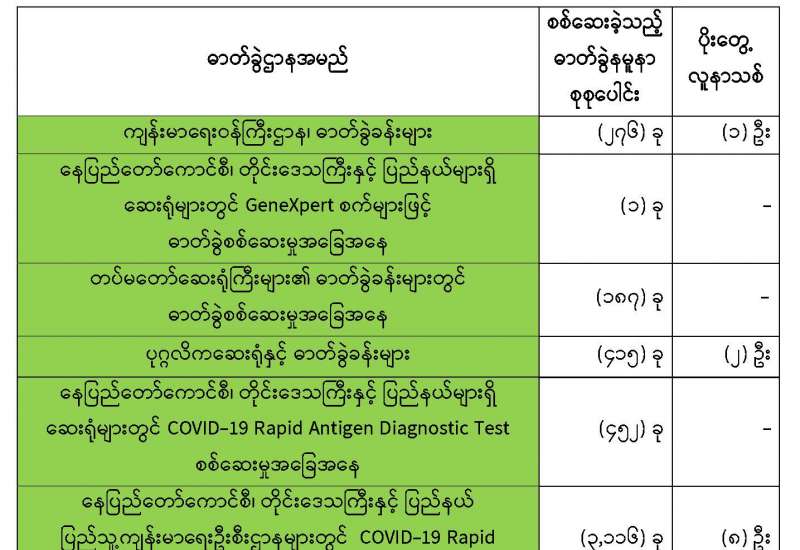 ကျန်းမာရေးဝန်ကြီးဌာနအနေဖြင့် နိုင်ငံအတွင်း ကူးစက်ဖြစ်ပွားနေသော COVID-19 ရောဂါ ကာကွယ်၊ ကုသ၊ ထိန်းချုပ်ရေးလုပ်ငန်းများကို အရှိန်အဟုန်မပြတ် ဆောင်ရွက်လျက်ရှိပါသည်။