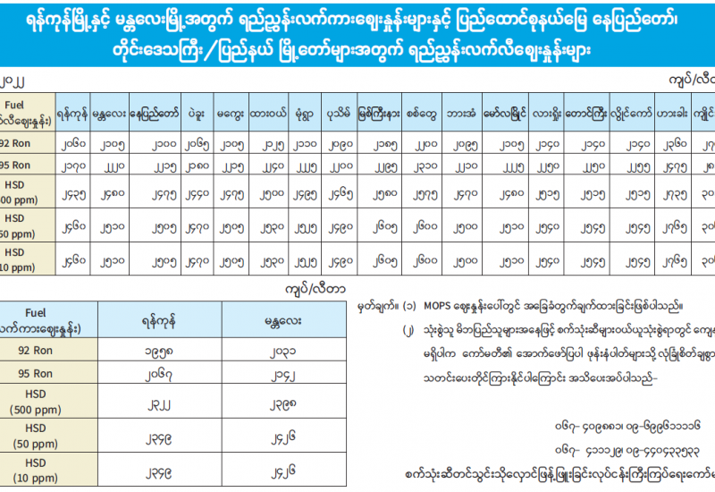 ရန်ကုန်မြို့နှင့် မန္တလေးမြို့အတွက် ရည်ညွှန်းလက်ကားဈေးနှုန်းများနှင့် ပြည်ထောင်စုနယ်မြေ နေပြည်တော်၊ တိုင်းဒေသကြီး/ပြည်နယ် မြို့တော်များအတွက် ရည်ညွှန်းလက်လီဈေးနှုန်းများ