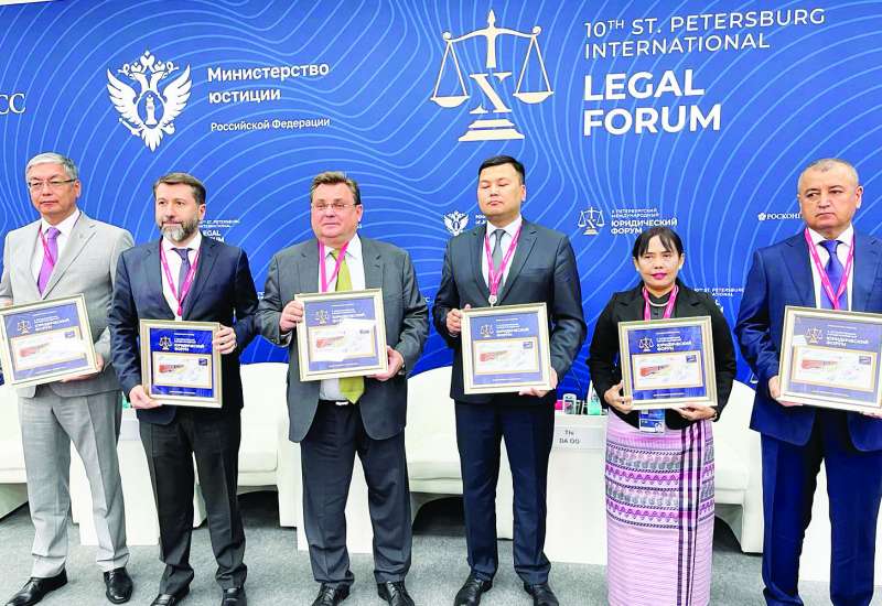 (၁၀) ကြိမ်မြောက် စိန့်ပီတာဇဘတ် အပြည်ပြည်ဆိုင်ရာဥပဒေရေးရာဖိုရမ် (10th St. Petersburg International Legal Forum) ကို ရုရှားဖက်ဒရေးရှင်း နိုင်ငံ စိန့်ပီတာဇဘတ်မြို့တွင် ဇွန် ၂၈ ရက်မှ ဇူလိုင် ၁ ရက်အထိ ကျင်းပရာ ရုရှားဖက်ဒရေးရှင်းနိုင်ငံ တရားရေးဝန်ကြီး H.E.Mr. Konstantin Chuy-Chenko ၏ ဖိတ်ကြားချက်အရ ဥပဒေရေးရာဝန်ကြီးဌာန ပြည်ထောင်စုဝန်ကြီးနှင့် ပြည်ထောင်စုရှေ့နေချုပ် ဒေါက်တာသီတာဦး ခေါင်းဆောင်သော မြန်မာကိုယ်စားလှယ်အဖွဲ့ တက်ရောက်လျက်ရှိသည်။