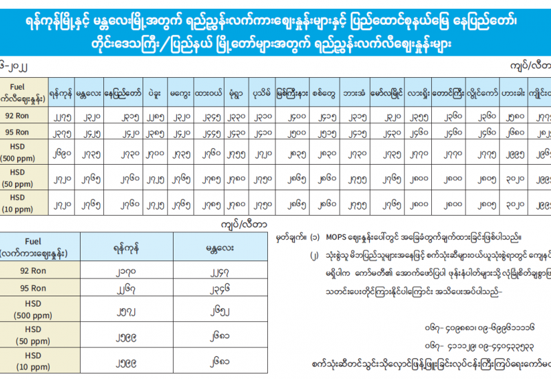 ရန်ကုန်မြို့နှင့် မန္တလေးမြို့အတွက် ရည်ညွှန်းလက်ကားဈေးနှုန်းများနှင့် ပြည်ထောင်စုနယ်မြေ နေပြည်တော်၊ တိုင်းဒေသကြီး/ပြည်နယ် မြို့တော်များအတွက် ရည်ညွှန်းလက်လီဈေးနှုန်းများ