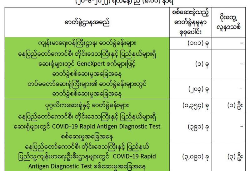 ကျန်းမာရေးဝန်ကြီးဌာနအနေဖြင့် နိုင်ငံအတွင်း ကူးစက်ဖြစ်ပွားနေသော COVID-19 ရောဂါ ကာကွယ်၊ ကုသ၊ ထိန်းချုပ်ရေးလုပ်ငန်းများကို အရှိန်အဟုန်မပြတ် ဆောင်ရွက်လျက်ရှိပါသည်။