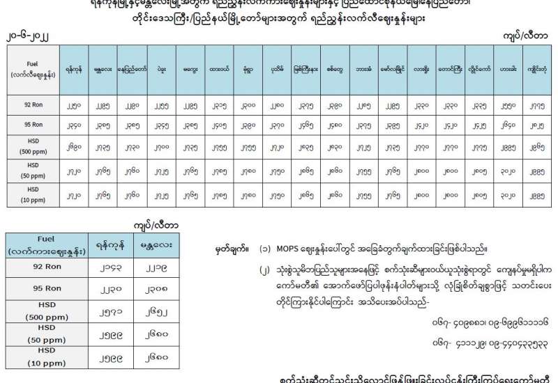 ရန်ကုန်မြို့နှင့်မန္တလေးမြို့အတွက် ရည်ညွှန်းလက်ကားဈေးနှုန်းများနှင့် ပြည်ထောင်စု နယ်မြေ၊ နေပြည်တော်၊ တိုင်းဒေသကြီး/ပြည်နယ်မြို့တော်များအတွက် ရည်ညွှန်းလက်လီ ဈေးနှုန်းများ