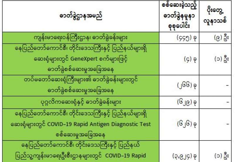 ကျန်းမာရေးဝန်ကြီးဌာနအနေဖြင့် နိုင်ငံအတွင်း ကူးစက်ဖြစ်ပွားနေသော COVID-19 ရောဂါ ကာကွယ်၊ ကုသ၊ ထိန်းချုပ်ရေးလုပ်ငန်းများကို အရှိန်အဟုန်မပြတ် ဆောင်ရွက်လျက်ရှိပါသည်။