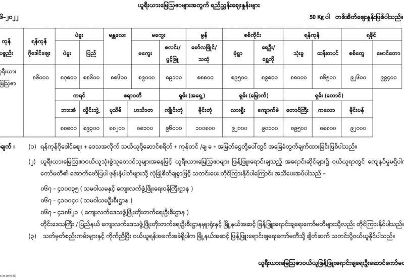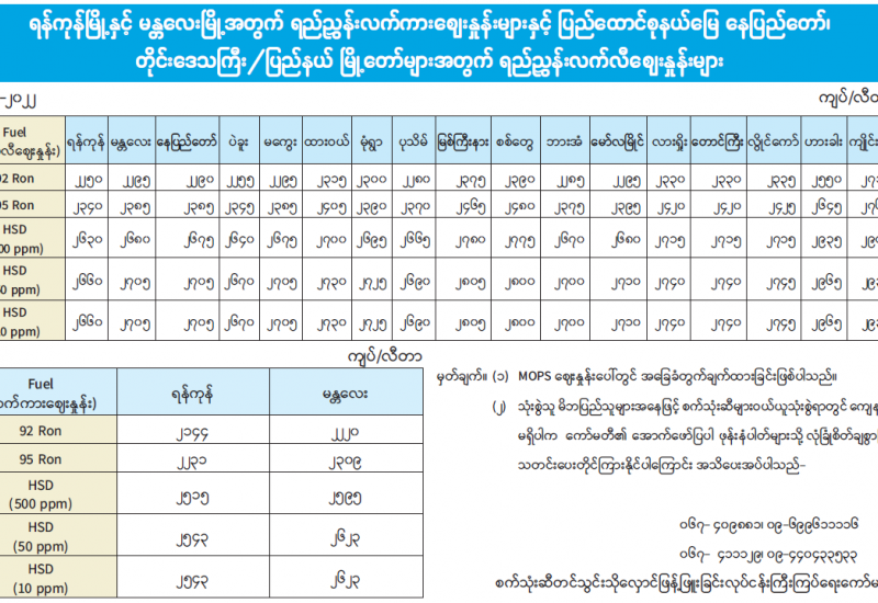 ရန်ကုန်မြို့နှင့် မန္တလေးမြို့အတွက် ရည်ညွှန်းလက်ကား ဈေးနှုန်းများနှင့် ပြည်ထောင်စုနယ်မြေ နေပြည်တော်၊ တိုင်းဒေသကြီး/ ပြည်နယ် မြို့တော်များအတွက် ရည်ညွှန်းလက်လီ ဈေးနှုန်းများ