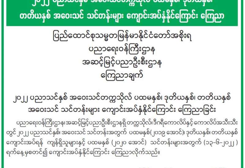 ဆေးတက္ကသိုလ်များနှင့် ဆေးပညာနှီးနွှယ်တက္ကသိုလ်များရှိ ပထမနှစ်သင်တန်းများ၏ လစ်လပ်နေရာများသို့ ပြောင်းရွှေ့တက်ရောက်နိုင်ရေး လျှောက်လွှာခေါ်ယူသည့် ကြေညာချက်