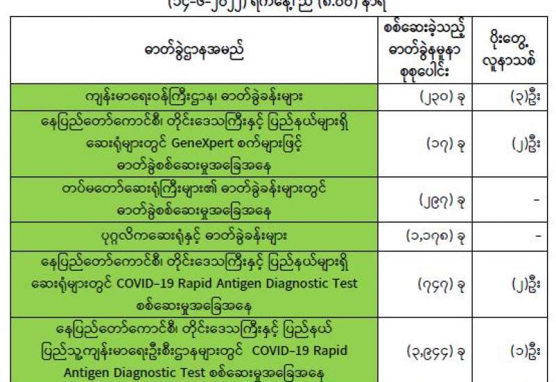 ကျန်းမာရေးဝန်ကြီးဌာနအနေဖြင့် နိုင်ငံအတွင်း ကူးစက်ဖြစ်ပွားနေသော COVID-19 ရောဂါ ကာကွယ်၊ ကုသ၊ ထိန်းချုပ်ရေးလုပ်ငန်းများကို အရှိန်အဟုန်မပြတ် ဆောင်ရွက်လျက်ရှိပါသည်။