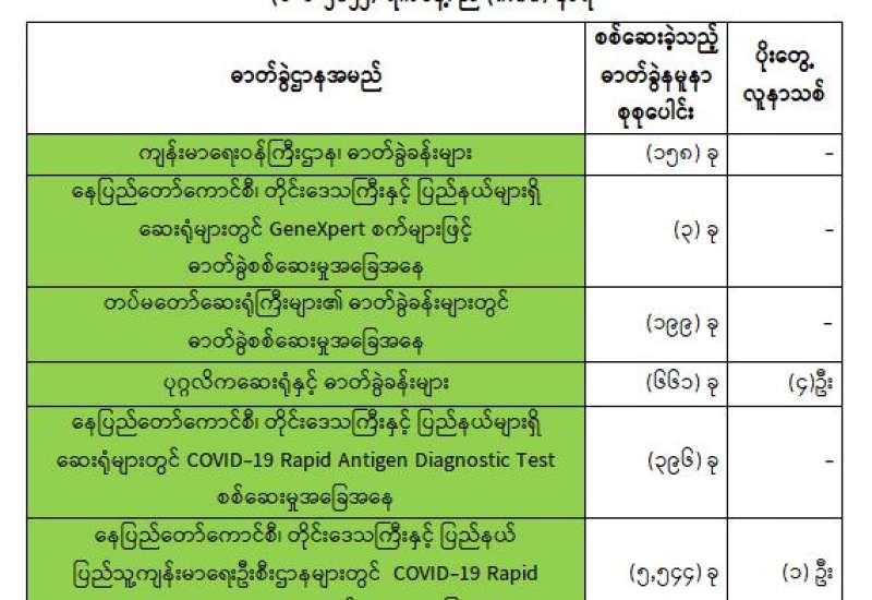 ကျန်းမာရေးဝန်ကြီးဌာနအနေဖြင့် နိုင်ငံအတွင်း ကူးစက်ဖြစ်ပွားနေသော COVID-19 ရောဂါ ကာကွယ်၊ ကုသ၊ ထိန်းချုပ်ရေးလုပ်ငန်းများကို အရှိန်အဟုန်မပြတ် ဆောင်ရွက်လျက်ရှိပါသည်။