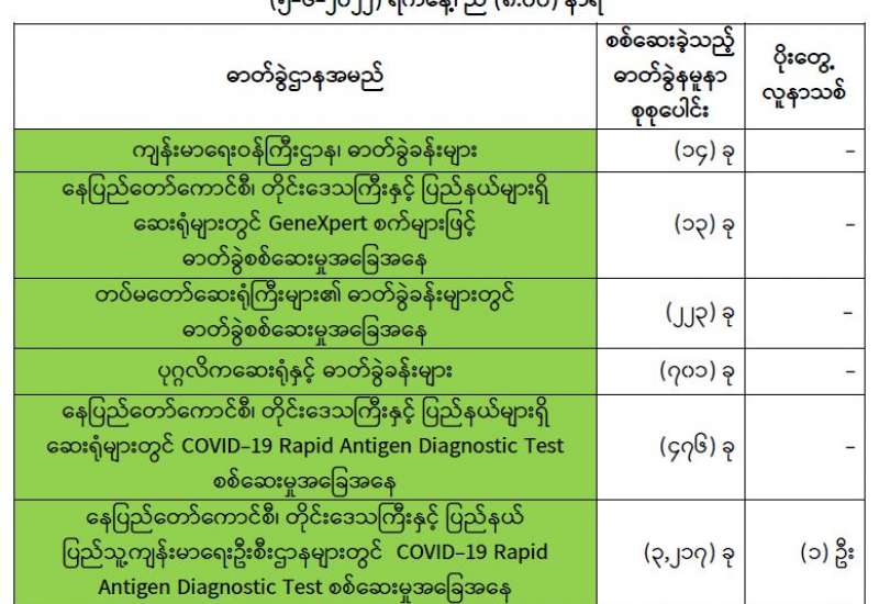 ကျန်းမာရေးဝန်ကြီးဌာနအနေဖြင့် နိုင်ငံအတွင်း ကူးစက်ဖြစ်ပွားနေသော COVID-19 ရောဂါ ကာကွယ်၊ ကုသ၊ ထိန်းချုပ်ရေးလုပ်ငန်းများကို အရှိန်အဟုန်မပြတ် ဆောင်ရွက်လျက်ရှိရာ ရောဂါထိန်းချုပ်ရေးလုပ်ငန်းများ အောင်မြင်နိုင်ရေးအတွက် ပြည်သူလူထုအနေဖြင့် ကျန်းမာရေးဝန်ကြီးဌာနမှ ထုတ်ပြန်ထားသော COVID-19 ရောဂါကာကွယ်ထိန်းချုပ်ရေးဆိုင်ရာ စည်းကမ်းများကို စနစ်တကျ လိုက်နာဆောင်ရွက်ရန်လိုအပ်ပြီး COVID-19 ကာကွယ်ဆေးထိုးနှံမှုခံယူခြင်းအား အထူးဂရုပြု ပူးပေါင်းဆောင်ရွက်ကြရန် လိုအပ်ပါသည်။