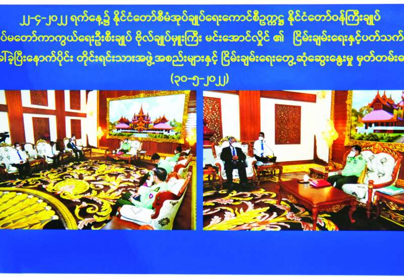 ပြည်ထောင်စုနယ်မြေ နေပြည်တော်တွင် စိုက်ပျိုးရေး၊ မွေးမြူရေးကဏ္ဍ ဖွံ့ဖြိုးတိုးတက်ရေးနှင့်စပ်လျဉ်းသည့် ညှိနှိုင်းအစည်းအဝေးကို ယနေ့မွန်းလွဲ ၂ နာရီတွင် နေပြည်တော်ကောင်စီရုံး အစည်းအဝေးခန်းမ၌ ကျင်းပရာ စိုက်ပျိုးရေး၊ မွေးမြူရေးနှင့်ဆည်မြောင်းဝန်ကြီးဌာန ပြည်ထောင်စုဝန်ကြီး ဦးတင်ထွဋ်ဦး၊ သမဝါယမနှင့် ကျေးလက်ဖွံ့ဖြိုးရေးဝန်ကြီးဌာန ပြည်ထောင်စုဝန်ကြီး ဦးလှမိုး၊ နေပြည်တော်ကောင်စီဥက္ကဋ္ဌ ဒေါက်တာမောင်မောင်နိုင်၊ နေပြည်တော်ကောင်စီအဖွဲ့ဝင်များ၊ ညွှန်ကြားရေးမှူးချုပ်များနှင့် ဌာနဆိုင်ရာ တာဝန်ရှိသူများ တက်ရောက်သည်။