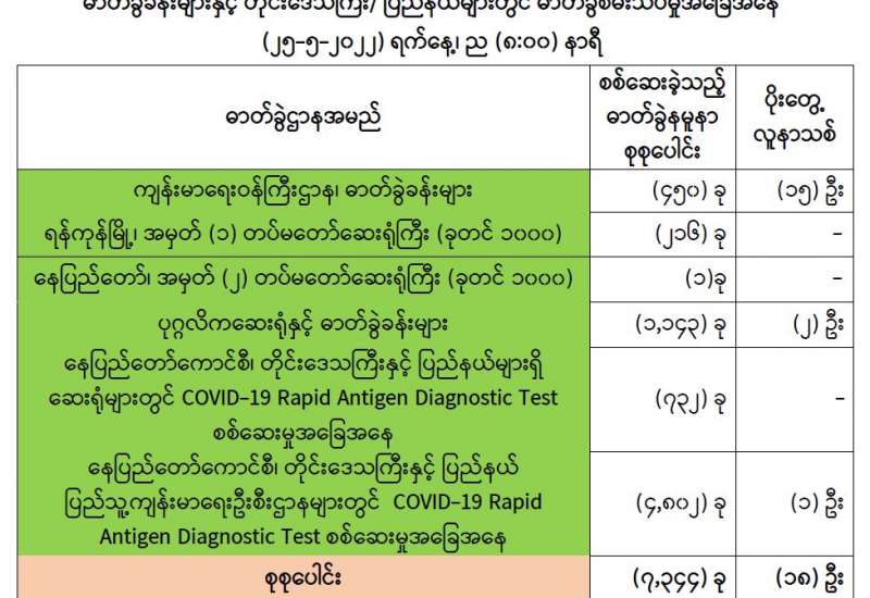 ကျန်းမာရေးဝန်ကြီးဌာနအနေဖြင့် နိုင်ငံအတွင်း ကူးစက်ဖြစ်ပွားနေသော COVID-19 ရောဂါ ကာကွယ်၊ ကုသ၊ ထိန်းချုပ်ရေးလုပ်ငန်းများကို အရှိန်အဟုန်မပြတ် ဆောင်ရွက်လျက်ရှိရာ ရောဂါထိန်းချုပ်ရေးလုပ်ငန်းများ အောင်မြင်နိုင်ရေးအတွက် ပြည်သူလူထုအနေဖြင့် ကျန်းမာရေးဝန်ကြီးဌာနမှ ထုတ်ပြန်ထားသော COVID-19 ရောဂါကာကွယ်ထိန်းချုပ်ရေးဆိုင်ရာ စည်းကမ်းများကို စနစ်တကျ လိုက်နာဆောင်ရွက်ရန်လိုအပ်ပြီး COVID-19 ကာကွယ်ဆေးထိုးနှံမှုခံယူခြင်းအား အထူးဂရုပြု ပူးပေါင်းဆောင်ရွက်ကြရန် လိုအပ်ပါသည်။