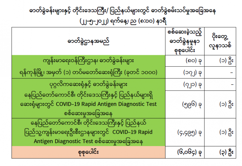 ကျန်းမာရေးဝန်ကြီးဌာနအနေဖြင့် နိုင်ငံအတွင်း ကူးစက်ဖြစ်ပွားနေသော COVID-19 ရောဂါ ကာကွယ်၊ ကုသ၊ ထိန်းချုပ်ရေးလုပ်ငန်းများကို အရှိန်အဟုန်မပြတ် ဆောင်ရွက်လျက်ရှိရာ ရောဂါထိန်းချုပ်ရေးလုပ်ငန်းများ အောင်မြင်နိုင်ရေးအတွက် ပြည်သူလူထုအနေဖြင့် ကျန်းမာရေးဝန်ကြီးဌာနမှ ထုတ်ပြန်ထားသော COVID-19 ရောဂါ ကာကွယ် ထိန်းချုပ်ရေးဆိုင်ရာ စည်းကမ်းများကို စနစ်တကျ လိုက်နာဆောင်ရွက်ရန် လိုအပ်ပြီး COVID-19 ကာကွယ်ဆေး ထိုးနှံမှုခံယူခြင်းအား အထူးဂရုပြု ပူးပေါင်းဆောင်ရွက်ကြရန် လိုအပ်ပါသည်။