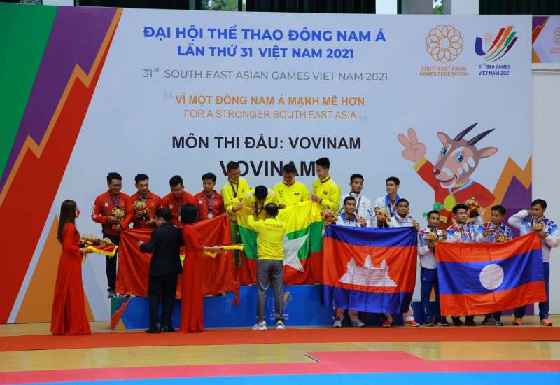 ဗီယက်နမ်နိုင်ငံ၌ အိမ်ရှင်အဖြစ် လက်ခံကျင်းပသည့် (၃၁)ကြိမ်မြောက် အရှေ့တောင်အာရှ အားကစားပြိုင်ပွဲကို မြို့အသီးသီးရှိ အားကစားကွင်း/ အားကစားရုံများ၌ ကျင်းပလျက်ရှိရာ ယနေ့ ညနေပိုင်းတွင် ဟနွိုင်းမြို့ရှိ Soc Son အားကစားရုံ၌ ဗိုဗီနမ်အားကစားနည်းမှ Male Leg Attack Technique 04 Males, Each Performs 2 Legs Attack Technique (လေးယောက်တွဲ)အပြပွဲစဉ်၌ မောင်အောင်ခိုင်လင်း၊ မောင်ရာဇာထွန်း၊ မောင်ဟိန်းထက်အောင်နှင့် မောင်ကျော်သူစိုးအောင်တို့က (၉)ခုမြောက် ရွှေတံဆိပ်ဆုကို ထိုက်ထိုက်တန်တန် ထပ်မံဆွတ်ခူးရယူပေးနိုင်ခဲ့ပြီး၊ (60)ကီလိုတန်း(အတိုက်)ပွဲစဉ်၌ မရွှေသက်ထားက ကြေးတံဆိပ်ဆုကို လည်းကောင်း၊ Bac Ninh Gymnasium အားကစားရုံ၌ လက်ဝှေ့အားကစားနည်းမှ (-57)ကီလိုတန်းပွဲစဉ်၌ မောင်နိုင်လတ်က ငွေတံဆိပ်ဆုကို လည်းကောင်း ထပ်မံဆွတ်ခူး ရရှိခဲ့ကြသည်။